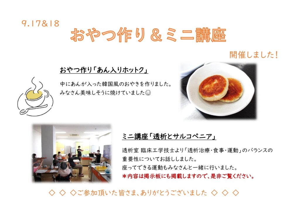 令和7年9月 おやつ作り&ミニ講座を開催しました 今回おやつ作りでは、あん入りホットクを作りました。 ミニ講座では「透析とサルコペニア」について臨床工学技士より解説がありました。 座ってできる運動を一緒に行い、みなさん一生懸命に取り組まれていました。 安心して参加いただけるよう、引き続き感染対策を実施しています。参加をご希望の方は、当院までお問い合わせください。 透析とサルコペニアダウンロード 前ページへ戻る